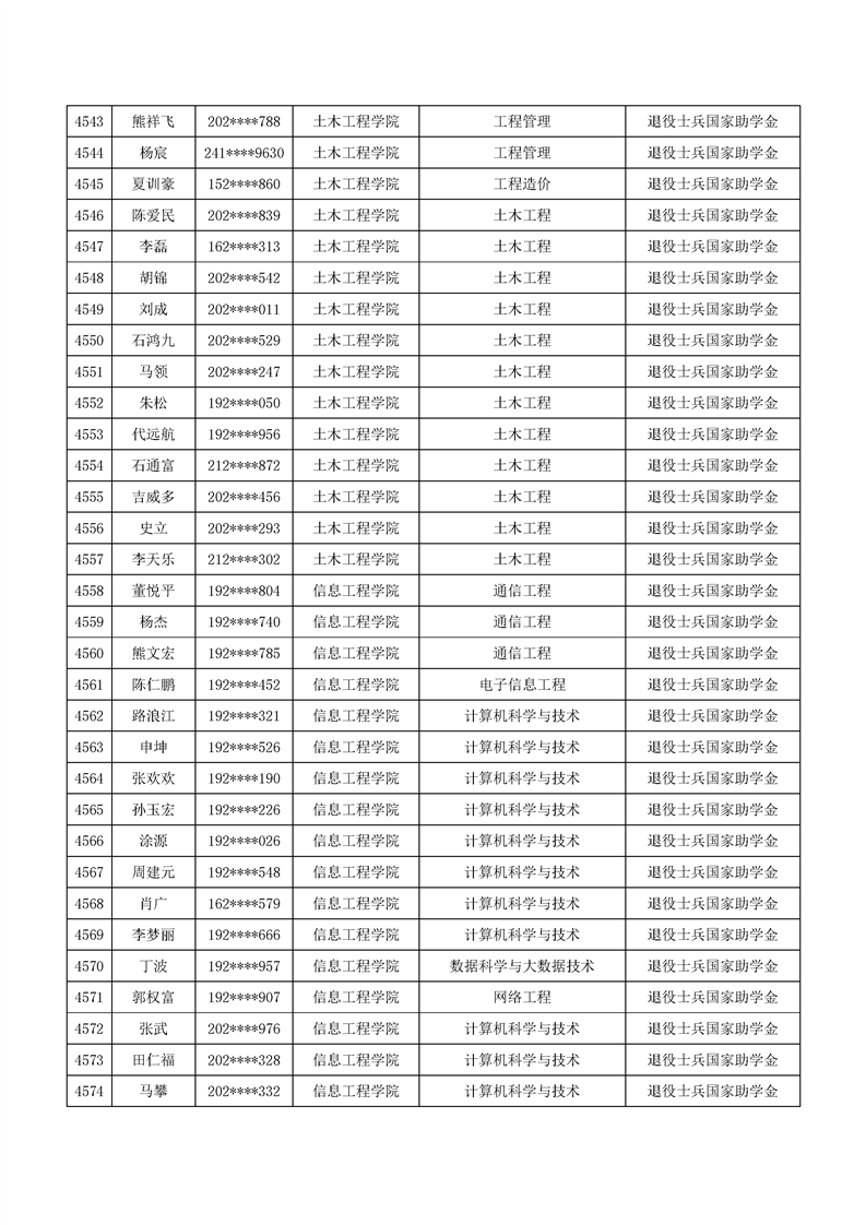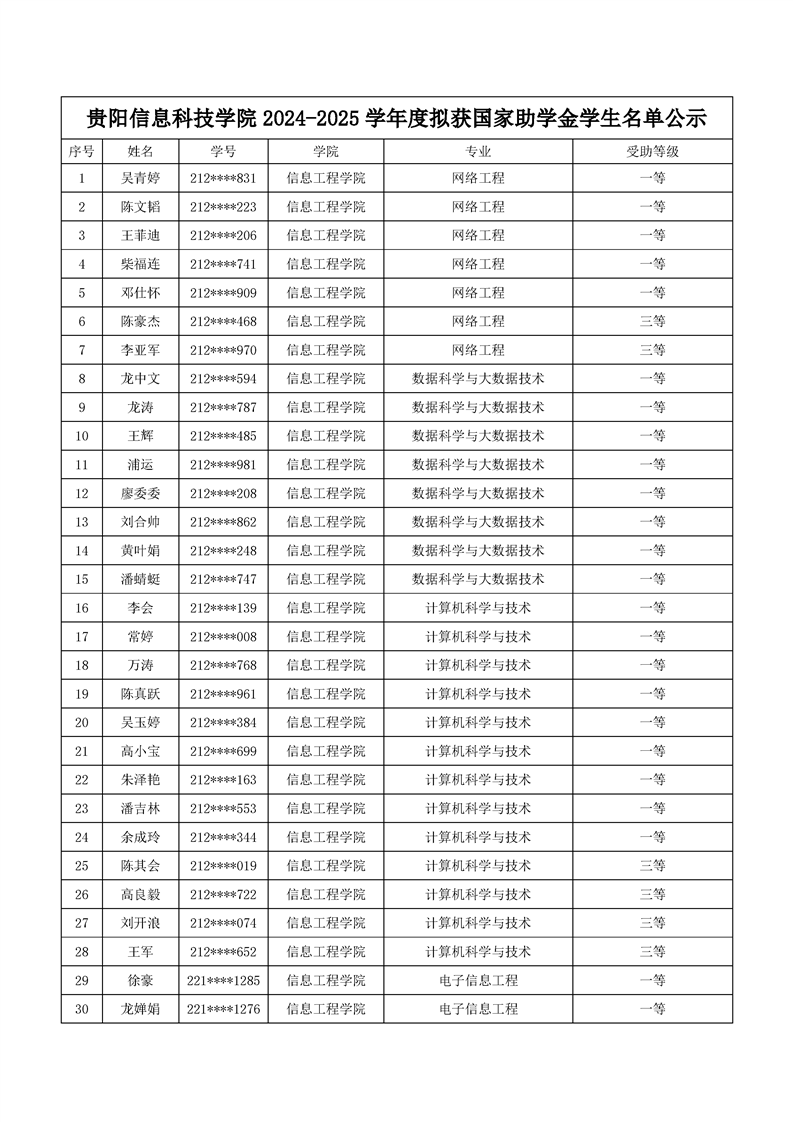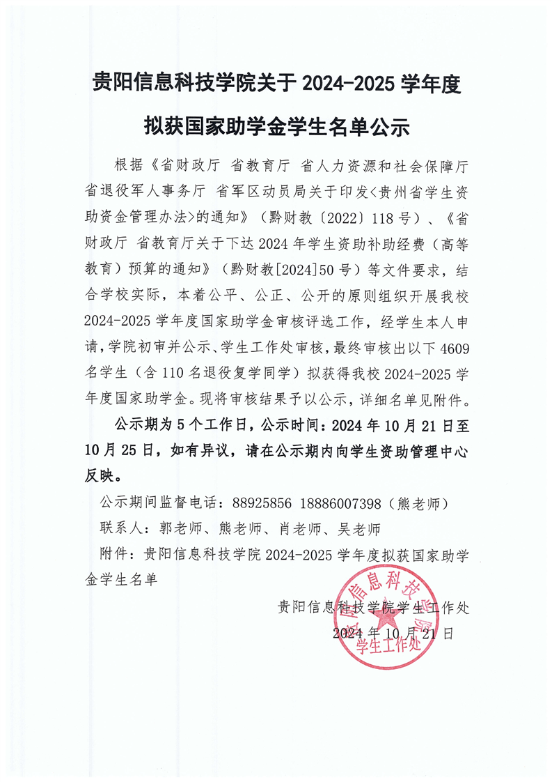 贵阳信息科技学院关于2024-2025学年拟获国家助学金学生名单公示