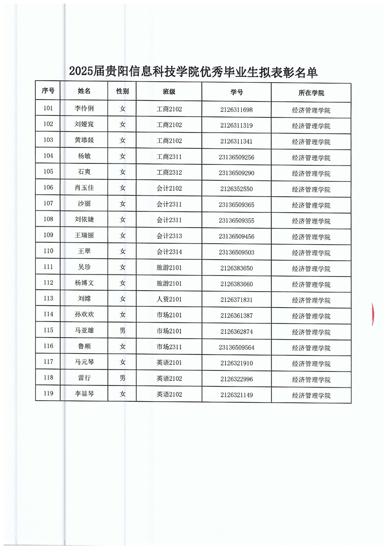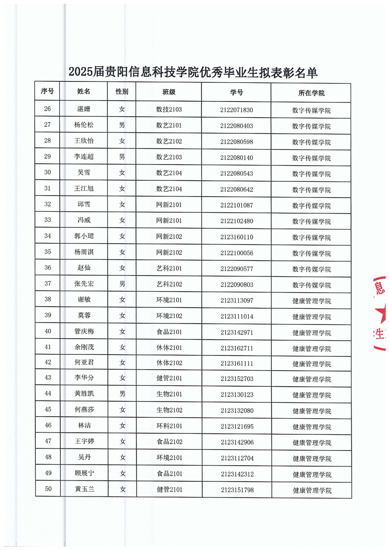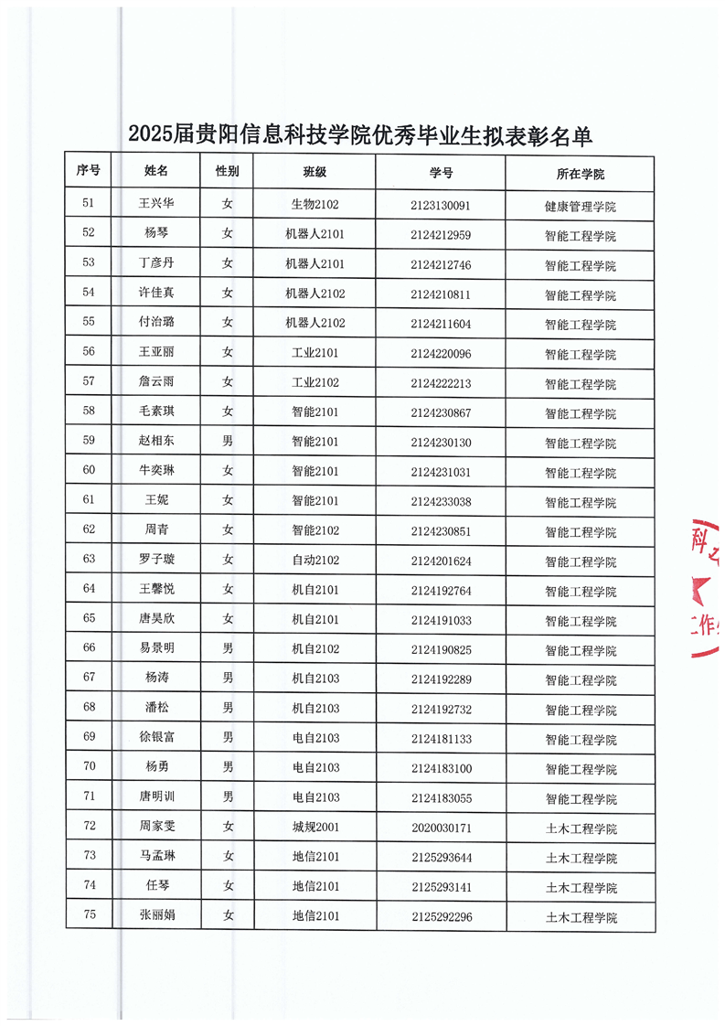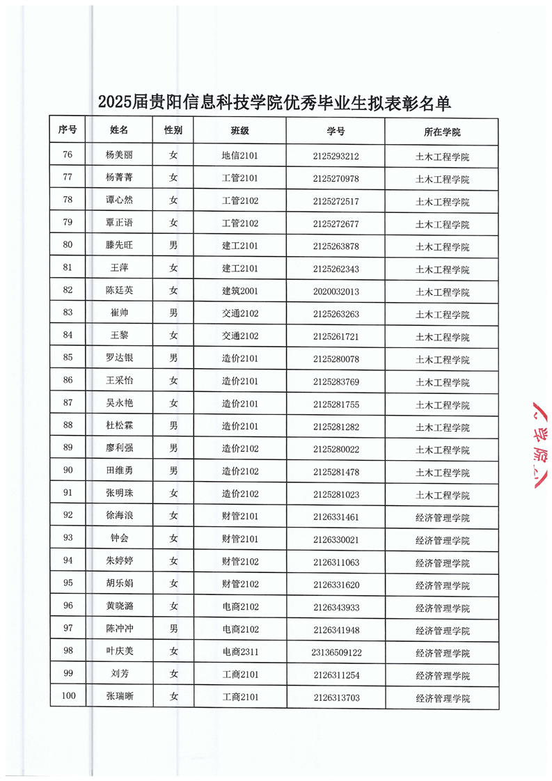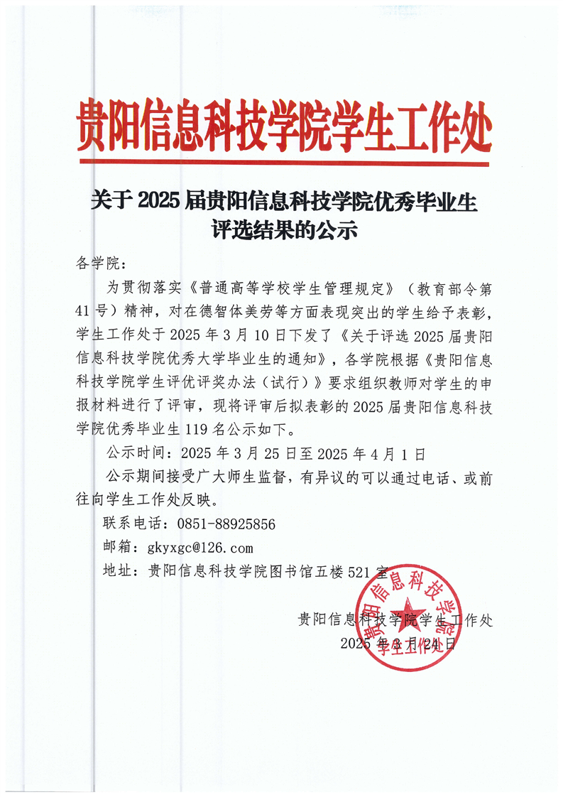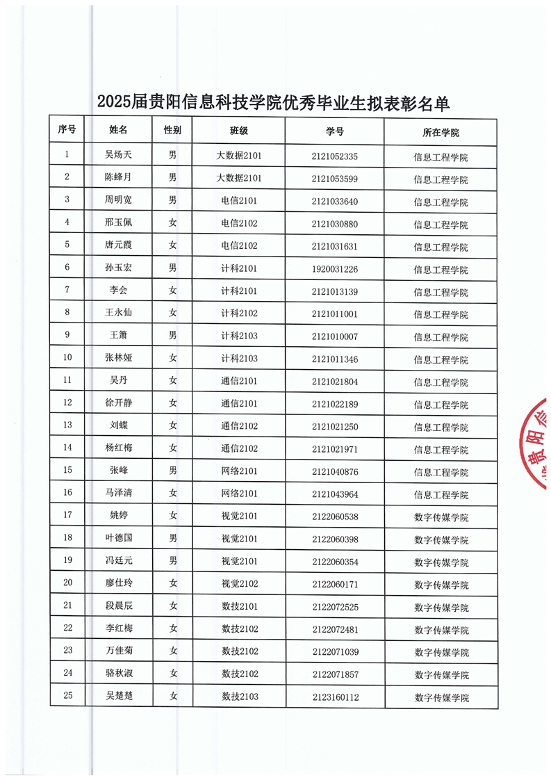 2025届贵阳信息科技学院优秀毕业生评选结果公示
