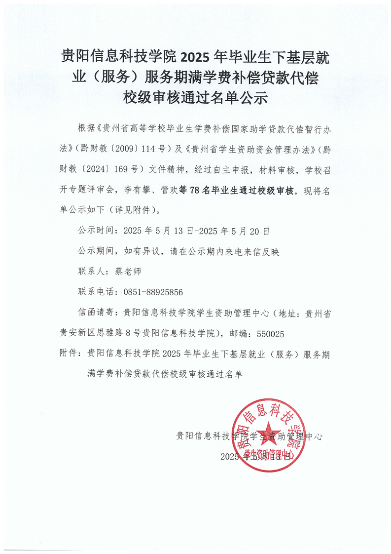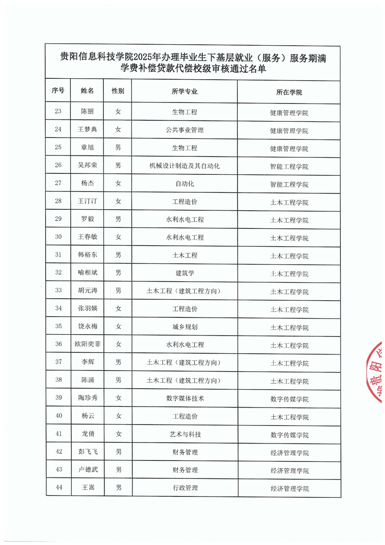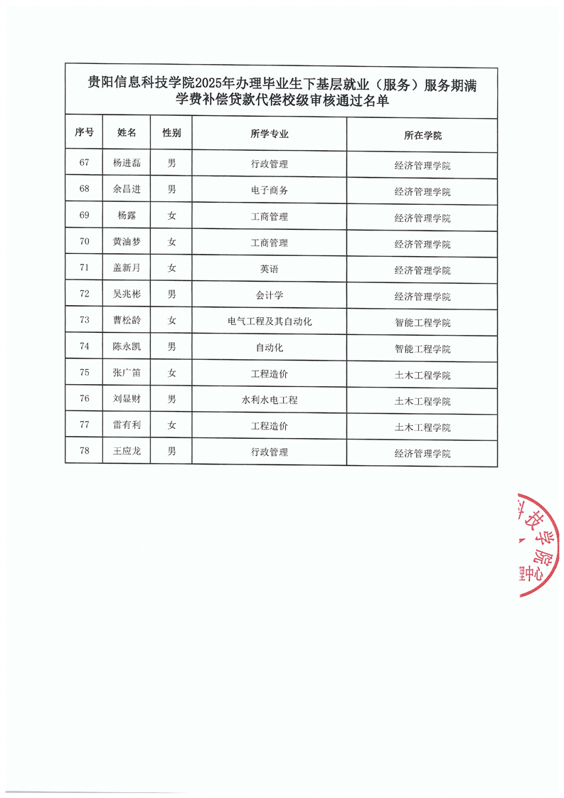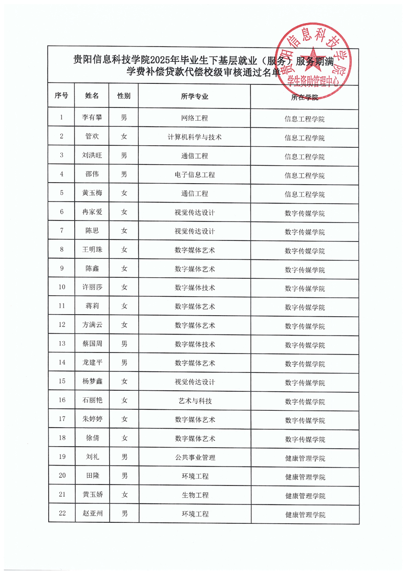 贵阳信息科技学院2025年毕业生下基层就业(服务)服务期满学费补偿贷款代偿 校级审核通过名单公示