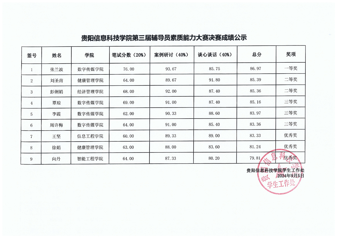 贵阳信息科技学院第三届辅导员素质能力大赛总成绩公示