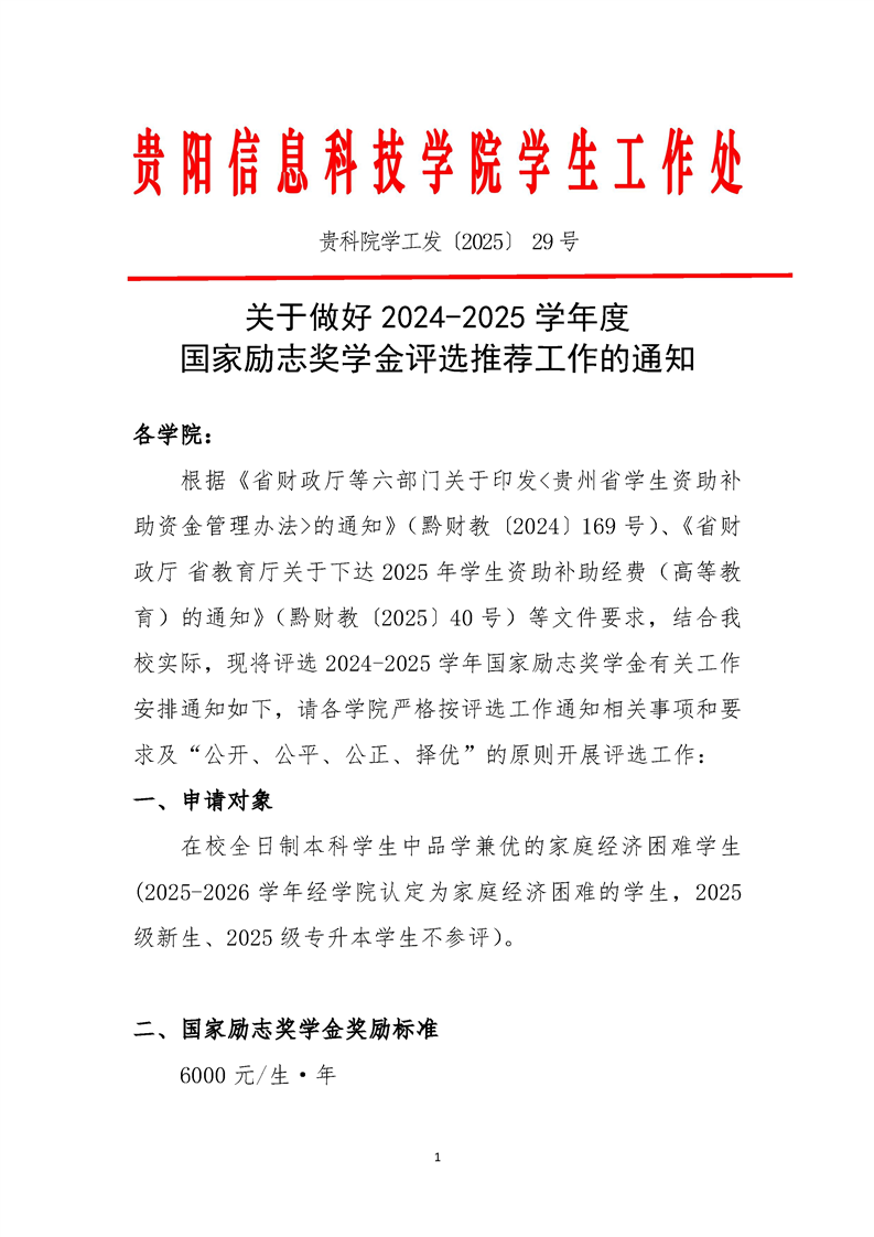 关于做好2024-2025学年度 国家励志奖学金评选推荐工作的通知