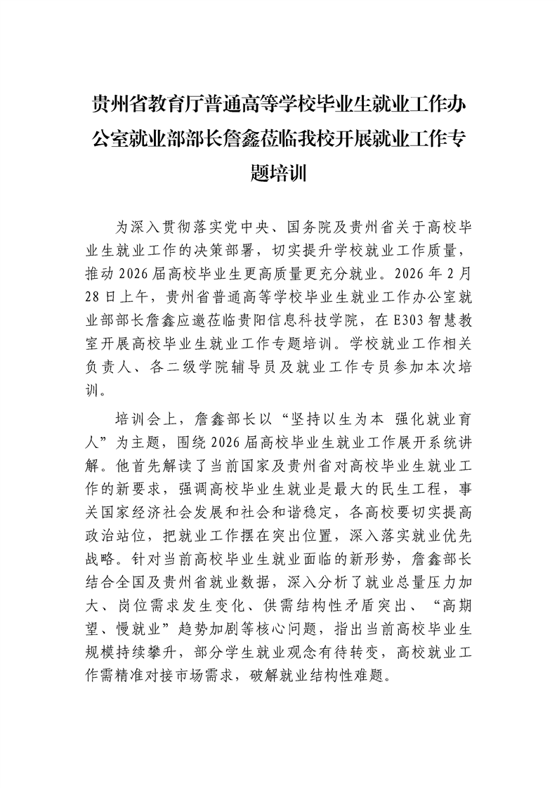 贵州省教育厅普通高等学校毕业生就业工作办公室就业部部长詹鑫莅临我校开展就业工作专题培训