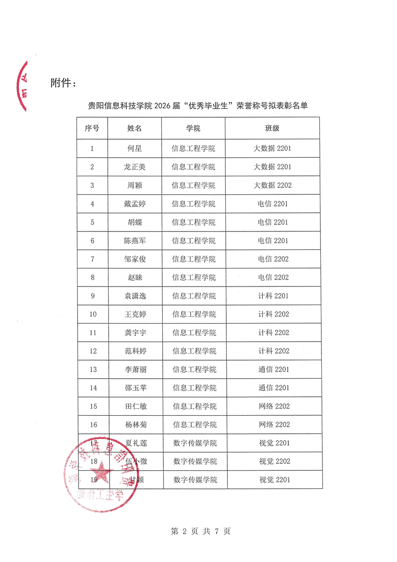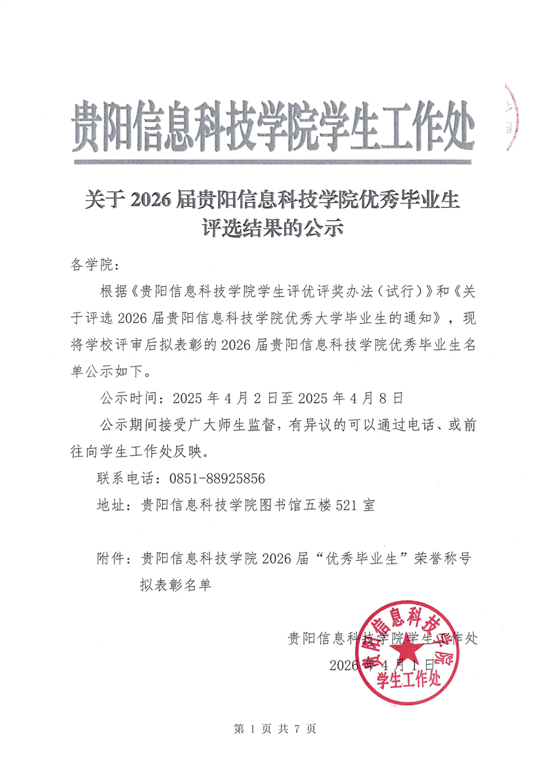 关于2026届贵阳信息科技学院优秀毕业生评选结果的公示
