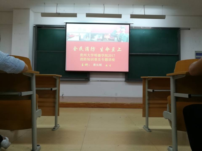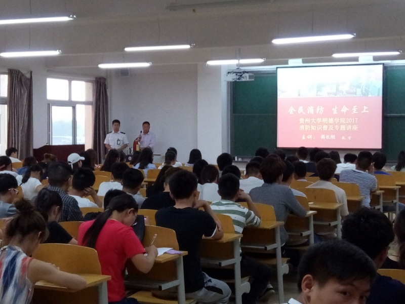 在讲座开始之前,贵州大学明德学院党委副书记金明辉同志代表讲话,表达了对蒋教官的感谢以及要求同学认真对待这次讲座,将学到的技能运用到生活中去。讲座中,蒋教官讲述了消防安全的相关知识,有关事例以及消防的重要性。从具体预防消防,遇见火灾方面讲起,为了防患于未然,在公共场合设置消防设备,灭火器,水枪,以及安装红色火警按钮等多种灭火设备。重点讲述了一旦发生火灾,同学们要保持清醒的头脑,学会随机应变,不能慌乱,在有机会的情况下报警,确保自己能够安全离开危险区域。同时还详细讲解了同学们在各个地方遇见火灾的具体脱险方法,让同学们一定要掌握在火灾中如何自救,增强火场逃生自救能力,一定要沉着冷静,及时脱险,保障自己的人身安全。