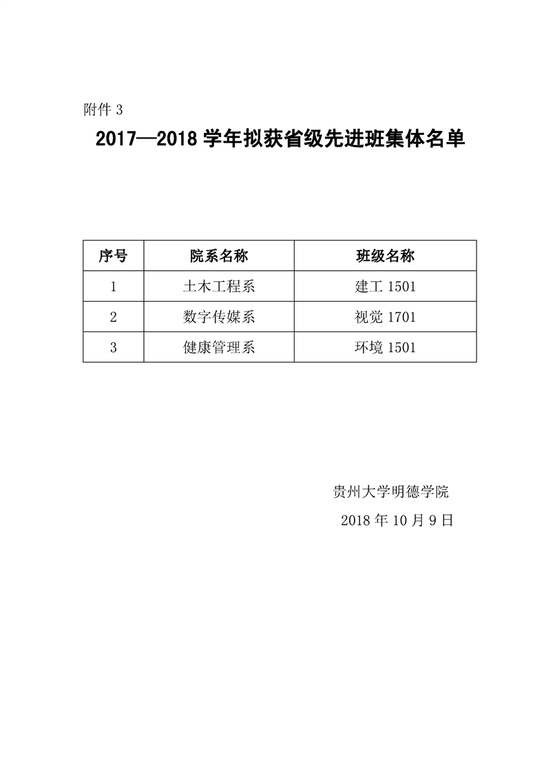贵州大学明德学院2018年贵州省普通高等学校三好学生、优秀学生干部、先进班集体公示