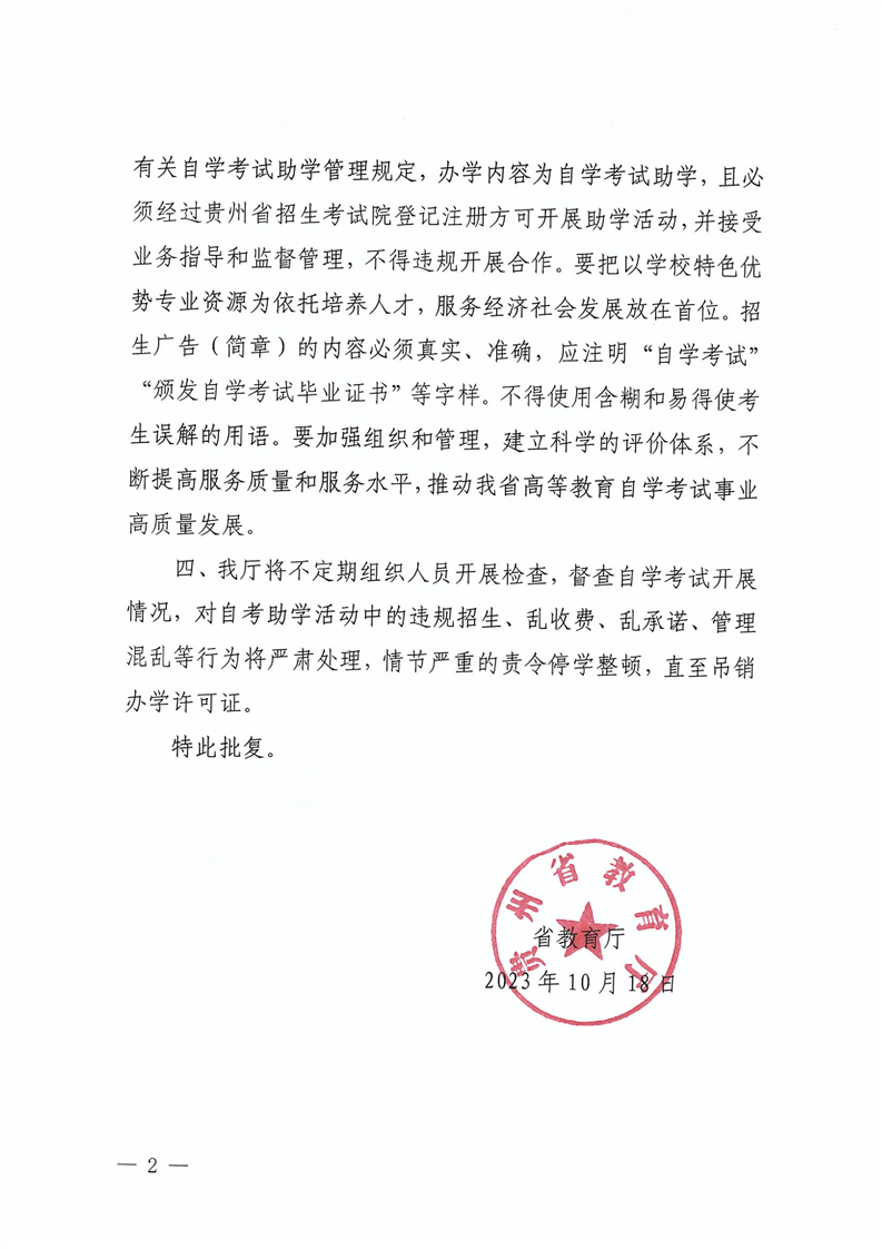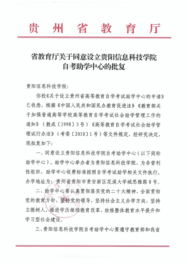 省教育厅批复同意设立贵阳信息科技学院自考助学中心