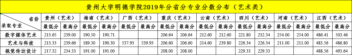 贵州大学明德学院2019年分省分专业分数分布(艺术类)