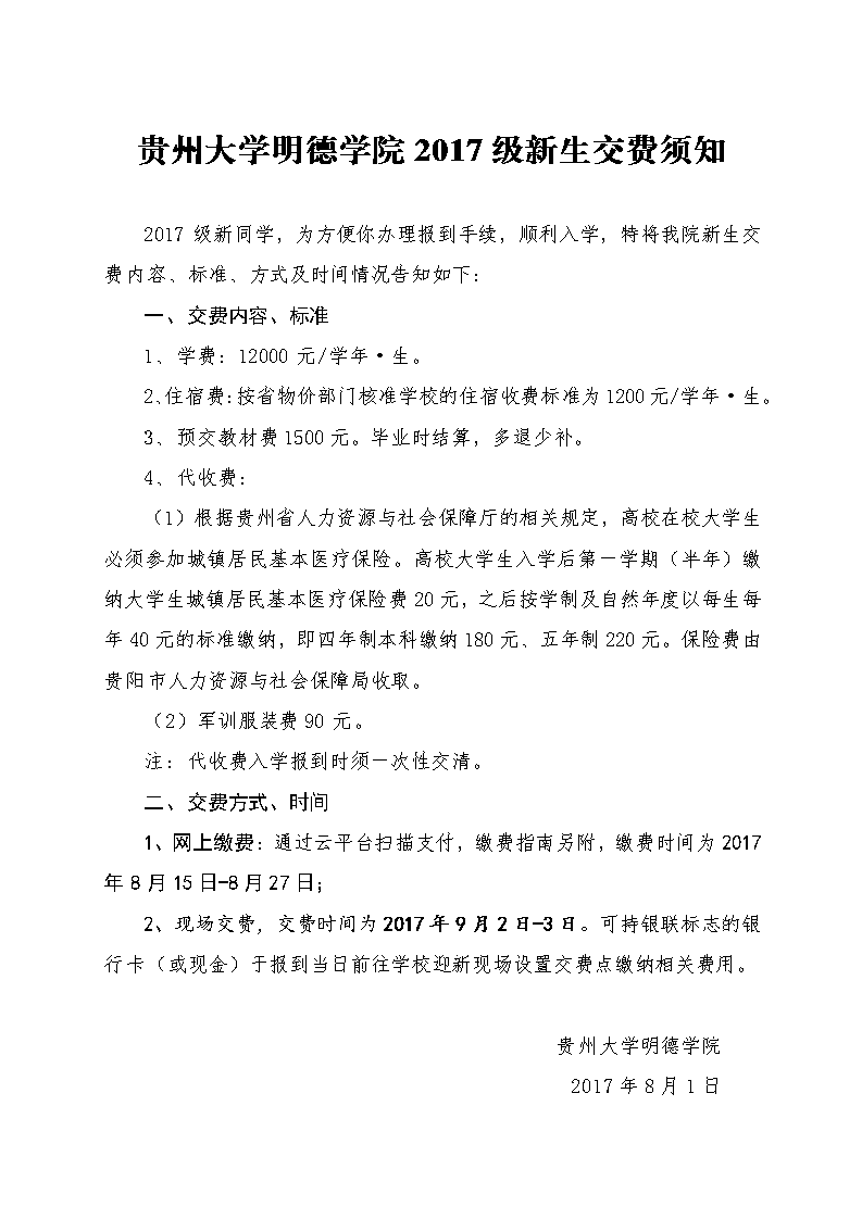 贵州大学明德学院2017级新生交费须知
